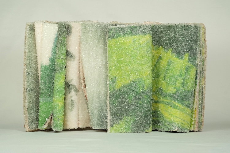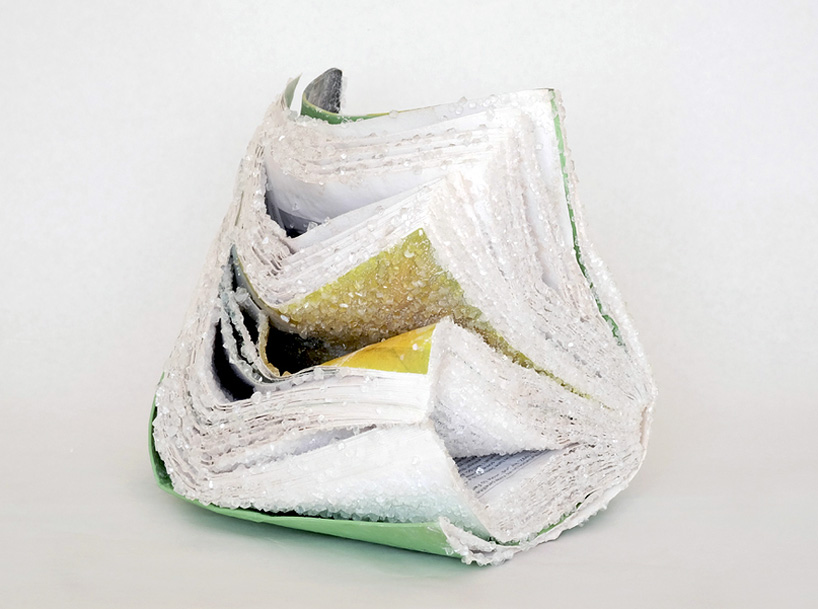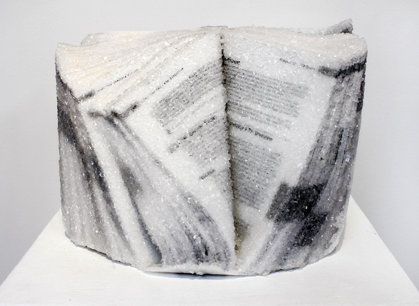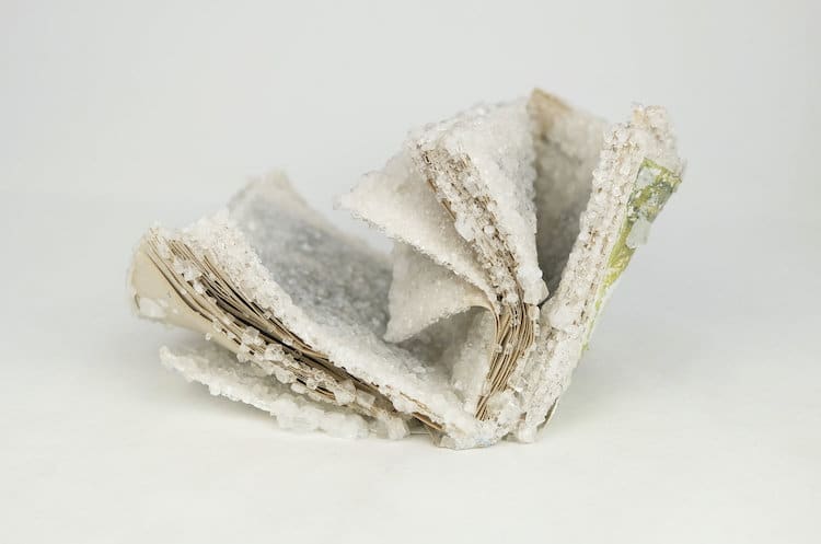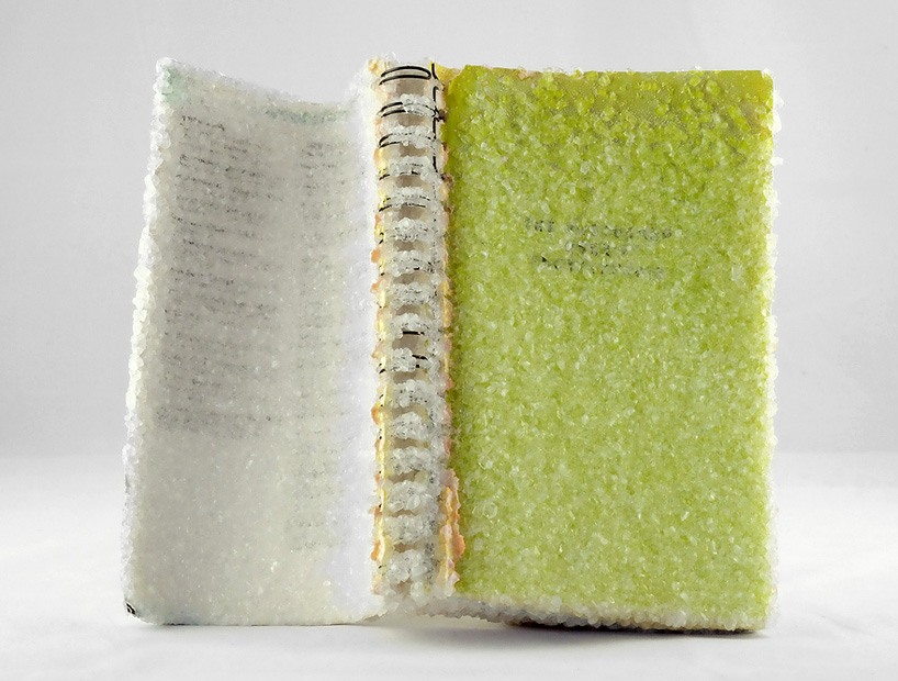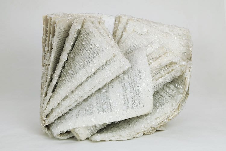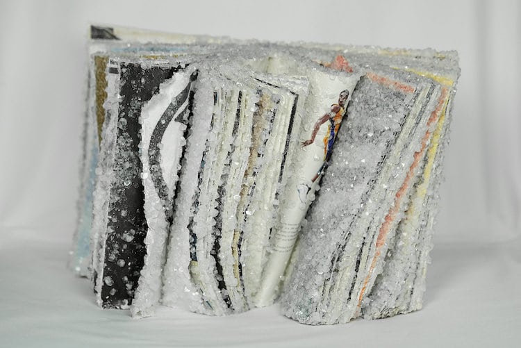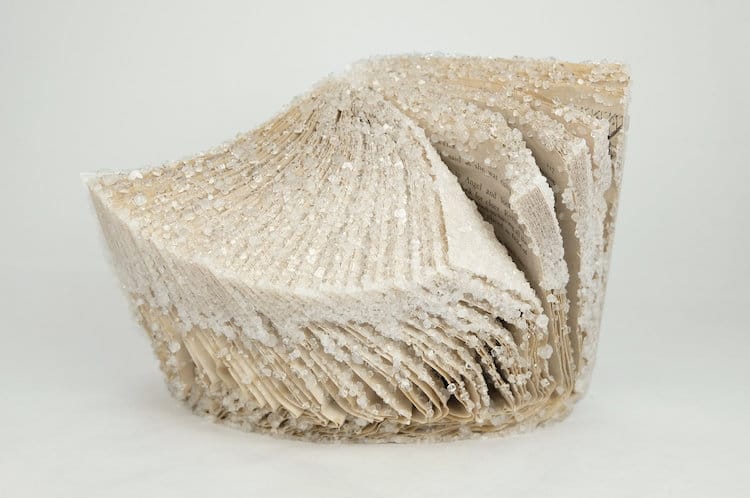 ▼Alexis將普通的舊書變成了璀璨的「水晶書」。她首先用水將書弄濕,讓書頁捲翹,然後將硼砂混合物溶於書本之上,最後放進冷凍庫,讓它凝固成雕塑的質地。