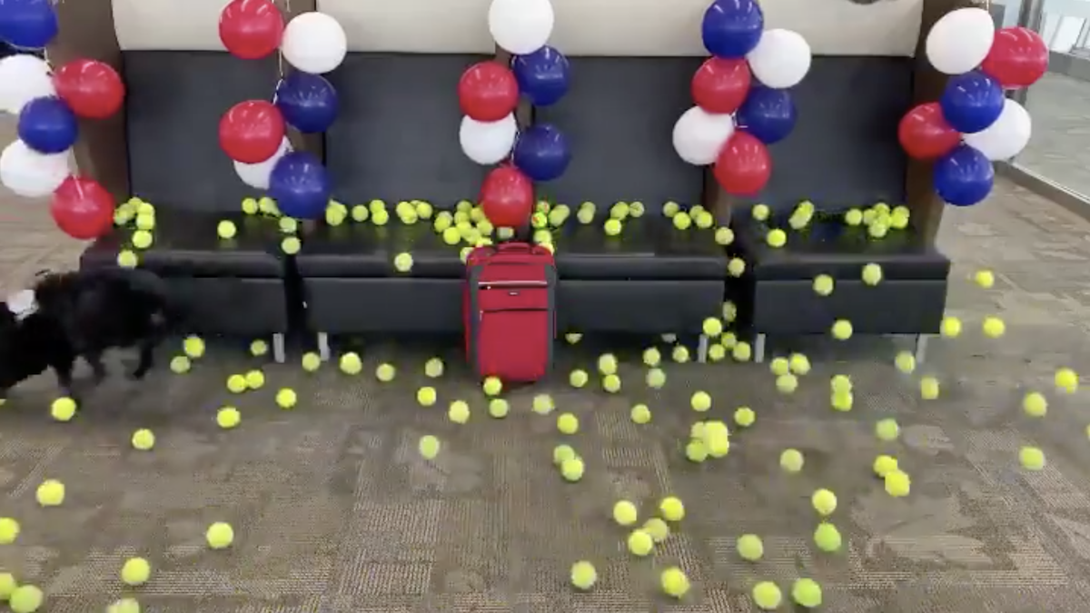 2020年06月20日在服務了8年後,美國這隻偵察犬TTirado終於可以光榮退休了,而在退休之前,還有一份最後的工作要交給牠,只見牠衝到一個紅色包包前嗅了嗅後,坐了下來,突然一陣驚喜的「網球雨」從天上降了下來!