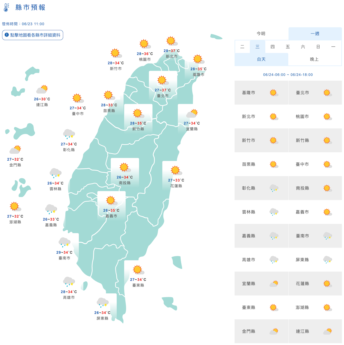 ▼週六、週日(27日、28日)開始水氣減少,各地多雲到晴,山區午後有雷陣雨,中南部的清晨上午有局部短暫陣雨,是典型的夏季天氣。