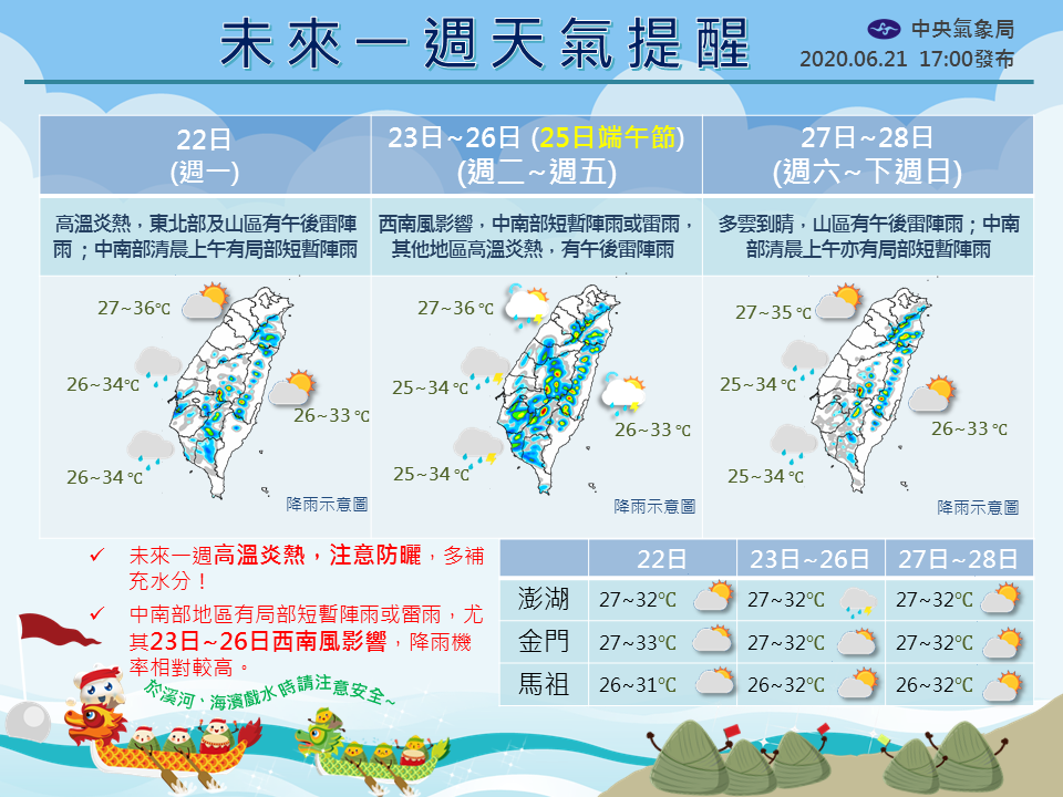 ▼氣象局預測,週二至週五(6月23日至26日)因西南風影響,各地呈現多雲到晴,而隨著西南風帶來水氣增多影響,中南部地區會有不定時降雨機率,但天氣依舊炎熱,午後山區則容易有熱對流發展,很有可能擴及周邊地區,所以全台需注意午後雷陣雨。