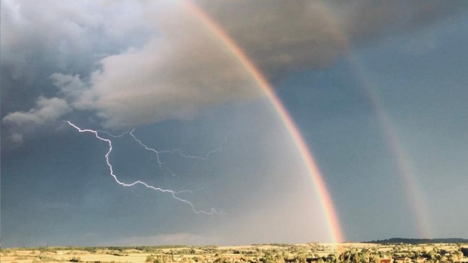 雷神一路跑過彩虹橋! 攝影師拍下「雙彩虹+閃電」奇景:天空化身唯美顏色