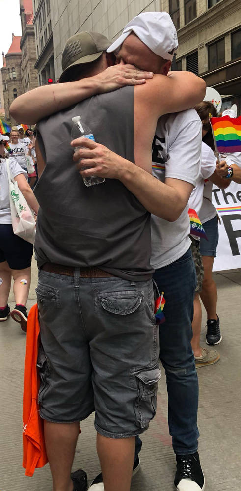 2020年06月26日在匹茲堡同志驕傲遊行(Gay Pride)上,一名叫Scott Dittman的男子穿著寫有「免費爸爸擁抱」字樣的上衣,跟那些不被原生家庭接受的孩子們擁抱。短短2個半小時,他就擁抱了700多次。這些擁抱有歡樂、有苦澀,也有期待,其中2名擁抱者給他留下了深刻的印象。