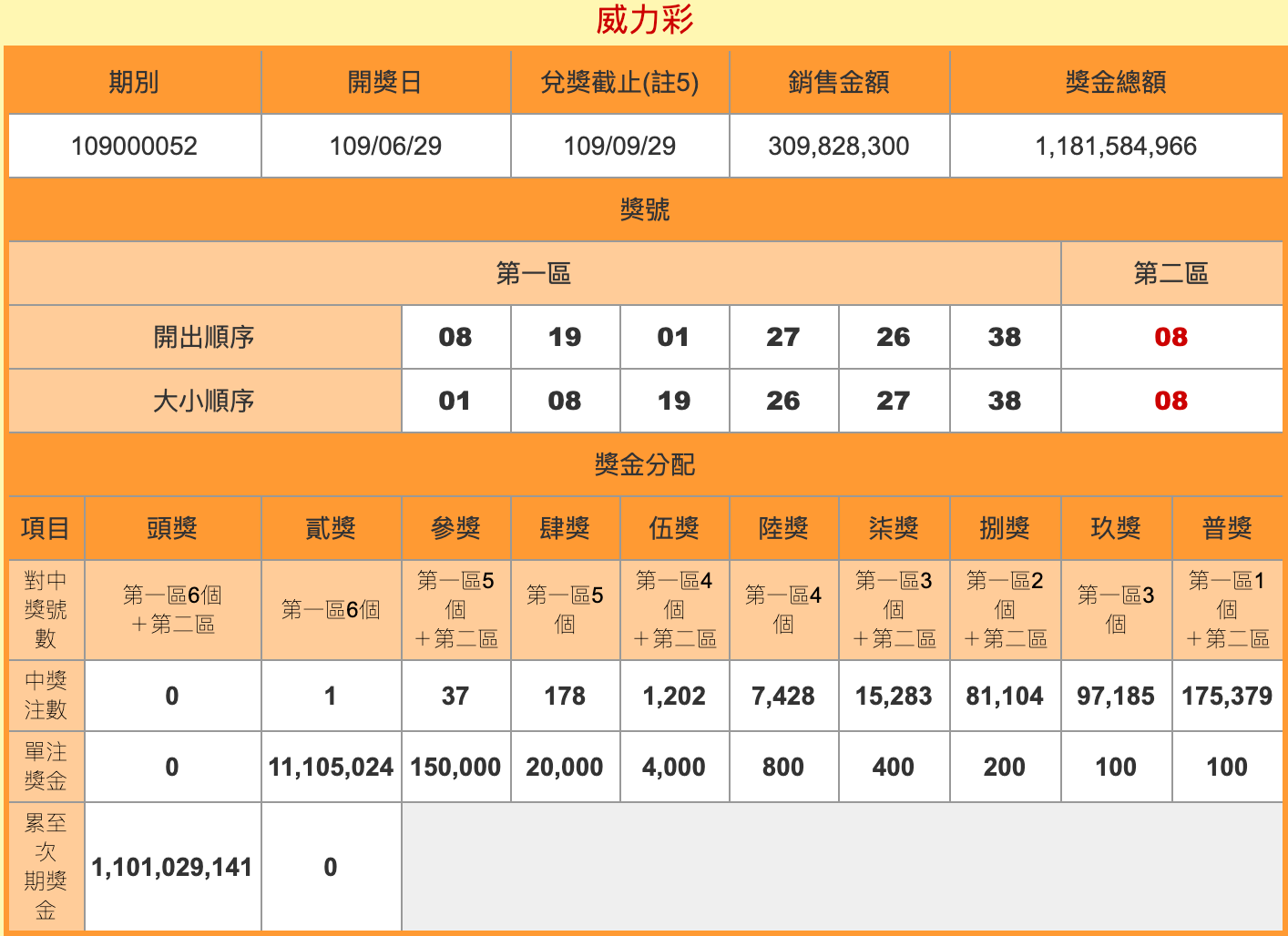 ▼威力彩在29日開出第109000052期號碼,第一區為01、08、19、26、27、38,第二區中獎號碼為08,本期也是無人中頭彩。