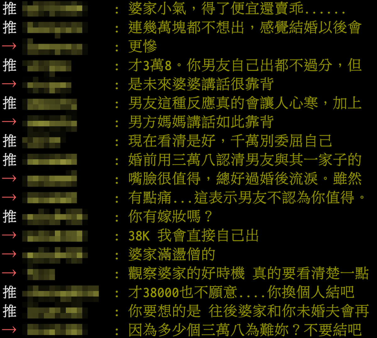 ▼加上自己並沒有對男方提出過多要求,只要在家簡單戴戒指儀式、登記和送餅而已,況且這80盒餅錢花費約才3.8萬元左右,卻被男方反駁只願出30盒,讓她覺得心好累,想問網友「自己要求很過份嗎」。貼文一出造成網友的議論,有許多網友認為是婆家小氣,這樣要求並不過分;但也有網友認為,因為沒有宴客所以男方收不到禮金,可以提問看看若是宴客的話,男方是不是就可以接受了。
