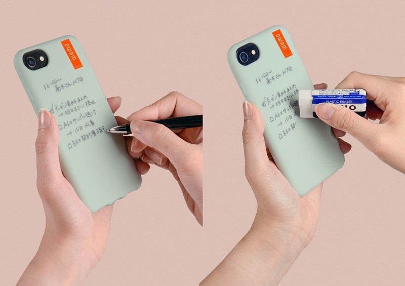 ▼可書寫手機殼:這款手機殼外觀樸素,但材質特別。它的表層是特別的塗料,能夠當成筆記本來用,拿油性筆就能書寫,碰到水字跡也不會模糊或消失。擦掉的時候也很簡單,用橡皮擦或手指都能輕鬆擦乾淨。