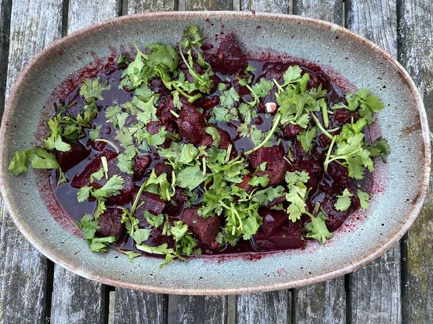 ▼Tuh’u:準備羊腿肉、水、油,拌入鹽、啤酒、洋蔥、芝麻葉、香菜、波斯紅蔥頭、孜然、甜菜根,再加蔥和蒜泥,最後撒上香菜。
