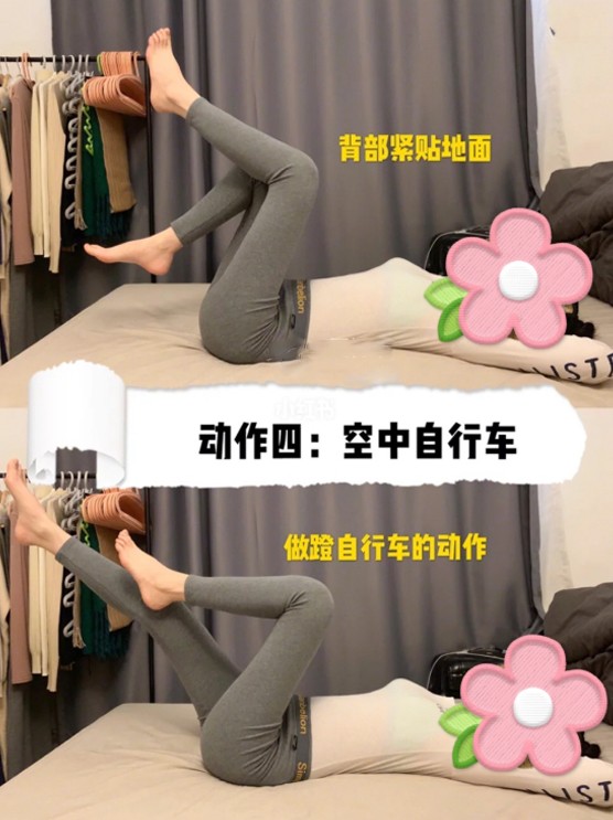 ▼4.空中自行車:平躺在瑜伽墊上,雙腿屈膝抬起,模擬蹬自行車的動作在空中以最大幅度畫圈,肌肉要保持緊繃。每天鍛鍊3分鐘。