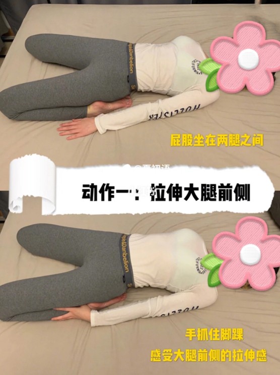 ▼1.拉伸大腿前側:跪坐在瑜伽墊上,屁股放在雙腳之間,身體慢慢向後躺,感受到大腿前側的拉伸感。每次鍛鍊2分鐘。