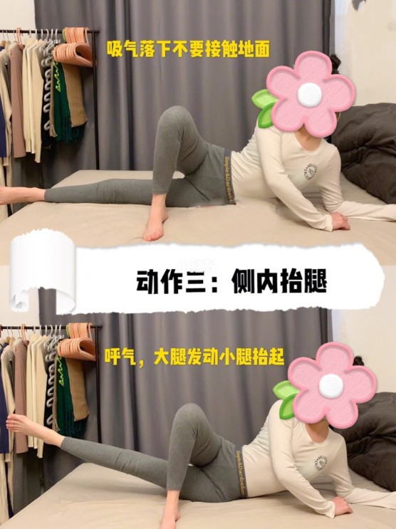 ▼3.側內抬腿:一條腿彎曲,踩在瑜伽墊上,呼氣的同時另一隻腿向上抬起;吸氣落下時不要落到瑜伽墊上。每次鍛鍊2分鐘。