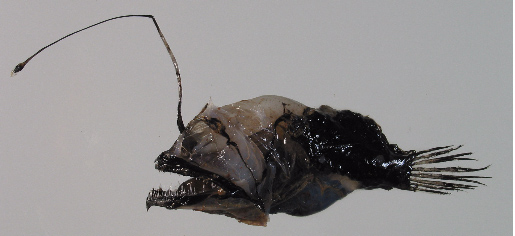 ▼俗稱「燈籠魚」的鮟鱇魚頭部擁有可以發光的特化背鰭,用來引誘獵物上門,但同時牠們的皮膚也具有黑素體可以吸收由自體發出的光線,以避免被獵物發現。