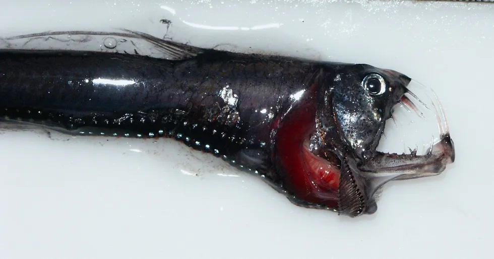 ▼斜齒圓帆魚的腸道具有吸收光線的細胞,科學家推測,雖然斜齒圓帆魚本身不會發光,但可能是因為以某些會發光的深海魚為主要食物來源,所以才會演化出可以吸收光的腸道皮膚,以免曝露自己的行蹤。