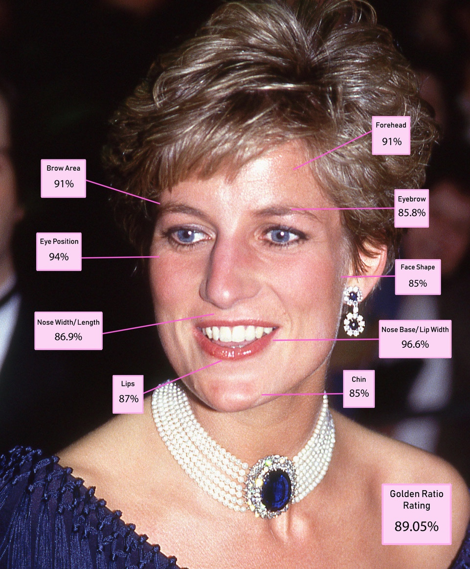 ▼第1名:89.05%,大家心目中永遠的黛安娜王妃,這第一拿的可說是實至名歸,但是純粹就比例上而言,除了長的最出色的臉型、鼻寬、額頭外,下巴和唇形的比例就略略低了些分。