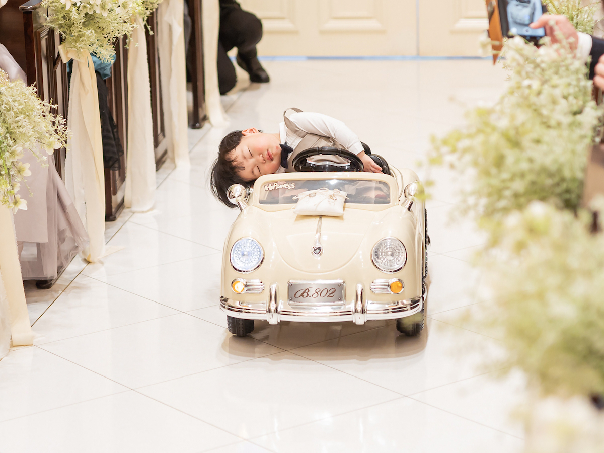 2020年07月24日大家對於去參加的婚禮典禮上,最有印象的一幕會是什麼呢?是新郎從新娘爸爸手中接過新娘嗎?還是新人們互相交換誓言的儀式呢?不管哪一段,相信一定都是滿滿的「感人」元素吧!結婚典禮上通常也少不了萌萌小花童,在這些稚氣可愛的小天使點綴下,讓整場婚禮襯托得更完整圓滿。但是在日本有一場婚禮,一位小花童疑似因為前一天沒睡飽,在領新人入場的遙控車上直接大睡特睡了起來,笑翻了來場的賓客們。