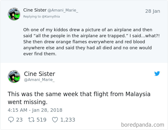 ▼「我其中一個小孩畫了一張飛機的圖片,然後說『飛機裡所有人都被困住了』我很吃驚…什麼?!她接著畫了一堆橘黃色的火焰和鮮紅的液體,說他們都離開世界了,沒有人能找到他們。」「那正是馬來西亞班機失蹤的那週。」