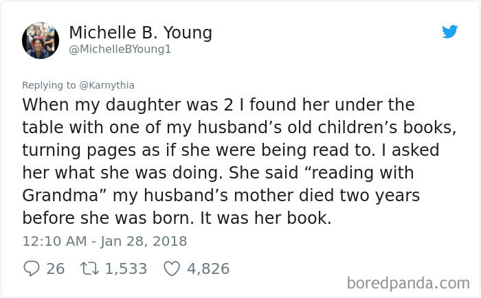 ▼「我女兒2歲時,有一次我發現她拿著我老公的舊童書躲在桌子底下,她翻書的樣子好像看得懂。我問她在看什麼,她說『跟奶奶一起看書』,但我老公的媽媽在2年前,女兒出生前就離開世界了。那本書是她的。」
