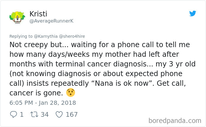 ▼「當時我帶著2歲小孩去家附近的墓園散步,她說『媽咪,石屋旁邊那個穿紅色外套的男人是誰啊?』然後指著某個墓。但那裡除了我們根本沒有別人,『他在對我招手耶,』說著她還揮了揮手,『他要來跟我說話了!』」
