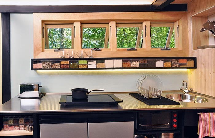 ▼沙發是由8張可以各自活動的儲藏椅所組成,可以隨需要組成小餐桌或是排成一長條沙發,自由度很高。廚房裡的小餐桌也是採可以折疊式的,全套木製的內裝配色,看起來很舒適。
