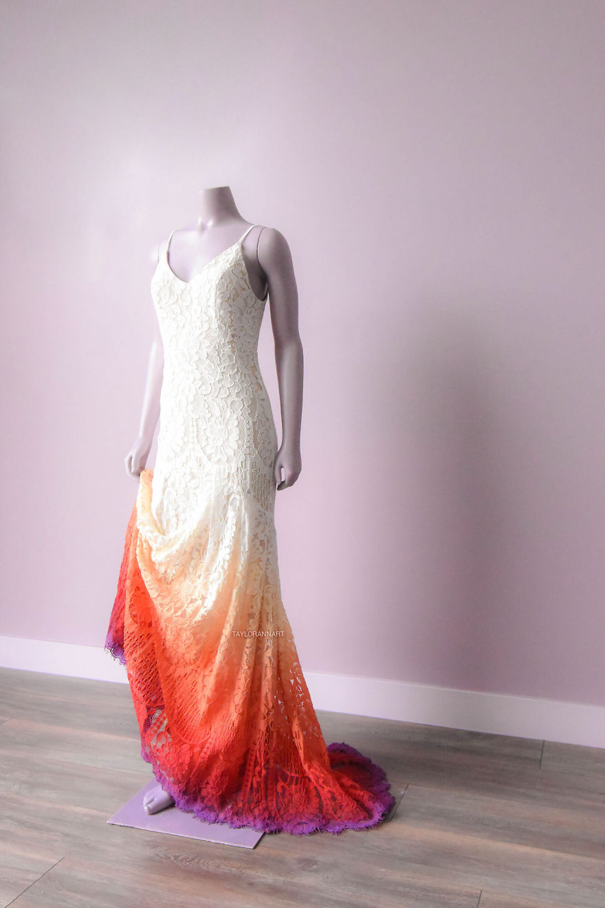 ▼婚禮前一週,Taylor的婚紗改造完成了!婚紗裙擺處漸層暈染的顏色就像火焰一般美麗。她還特別搭配了頭髮顏色,準備了跟婚紗同色系的捧花。婚禮上她出場時所有賓客都眼前一亮!