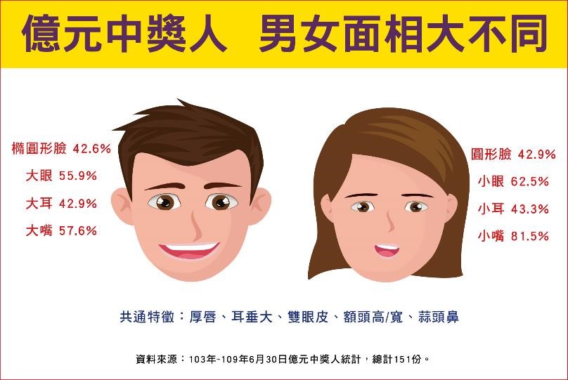 ▼台灣彩券舉辦了「億元中獎人 男女不一樣」的記者會,根據台彩公司統計,從2014年以來至今年6月,151位億元中獎者當中,男生有116位、女生有35位,男、女佔比各是77%和23%。台彩總經理蔡國基指出,男、女中獎人特徵有明顯不同,男生多半長相大器,大眼睛(55.9%)、大嘴巴(57.6%)、大耳朵(42.9%);女生中獎人則是秀氣五官居多,小眼睛(62.5%)、小嘴巴(81.5%)、小耳朵(43.3%)。