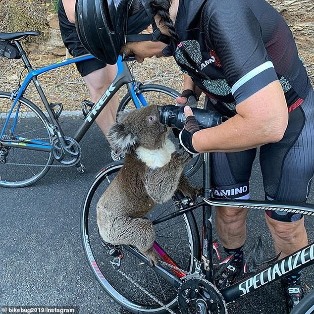 ▼看到Anna拿出水來,無尾熊主動爬上自行車,牠的速度非常快,顯然很口渴。接著牠抱起水瓶,迫不及期待喝起水來。