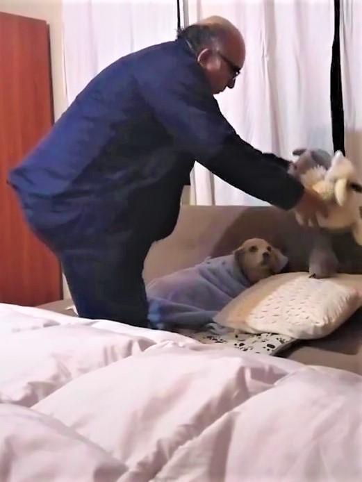 ▼每晚睡覺前,爸爸都會把小狗抱到牠的小床上,幫忙蓋上小被被、塞好枕頭,一臉慈祥地笑著看狗狗入睡。
