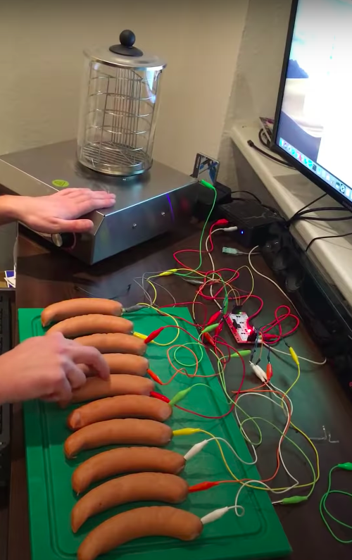 ▼從影片中可以看到,桌面上擺著10根香腸,香腸上連著一些線。輕輕碰一下這些香腸,就能發出鋼琴聲,而且每一根香腸的聲音都不一樣,看起來非常好玩。