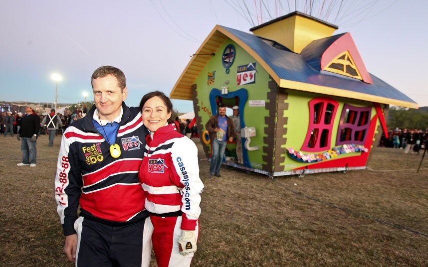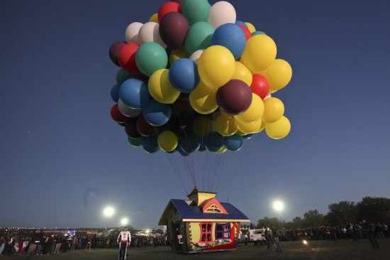 ▼強納森設計了一座繽紛的彩繪小屋,並以較輕的救生艇為底,已減輕氣球負荷重量。搭配上七彩氣球,飛行起來時乍看起來跟熱氣球很相近,但是不同的是綁的是氦氣球。經過了很多次的測試之後,在很多觀眾的見證下,這樣真人版的「天外奇蹟」就這樣誕生了!