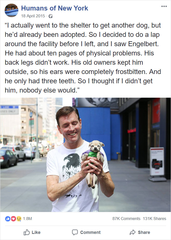 ▼「我到動物收容所領養一隻狗狗,結果牠卻已經被別人帶回家了,於是我在收容所到處逛逛,最後碰到了 Engelbert。他的醫療報告大概有10頁那麼多,後腿也已經無法行動,耳朵完全受凍,牙齒也只剩下3顆。我知道如果我不領養牠的話,就沒有其他人會了!」
