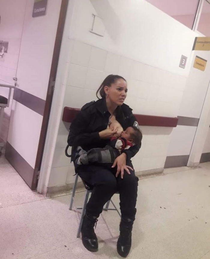 ▼一位女警在醫院執勤時,還必須為剛出生沒多久的孩子喂母乳。