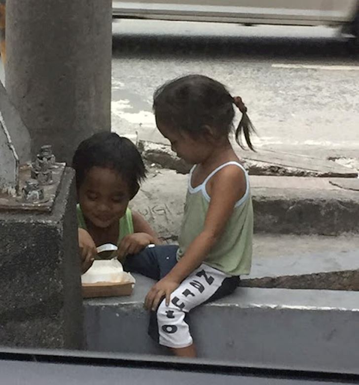 ▼在2016年的12月12日,一對到馬尼拉旅遊的情侶遇見了行討的小男孩,於是給了他一份速食餐點,當時小男孩拿了情侶給的餐點後馬上就迅速離去,這對情侶當下也並不覺得有什麼違和感。但是當這對情侶轉身之後,卻看到了令他們感到驚訝的畫面,原來小男孩拿到餐點後,並不是自己獨享,而是拿到一旁分給自己年紀更小的妹妹吃。