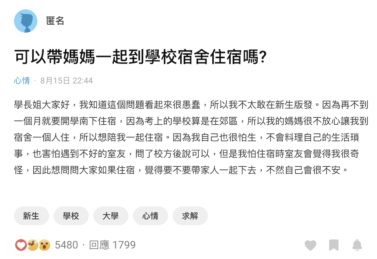 2020年08月18日一名男大生匿名在Dcard貼文表示,自己即將要展開大學新生活了,再1個月不到後將南下住進學校宿舍,但是由於學校位處郊區,他媽媽不放心他一個人入住宿舍,所以想「陪同入住」。