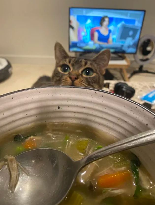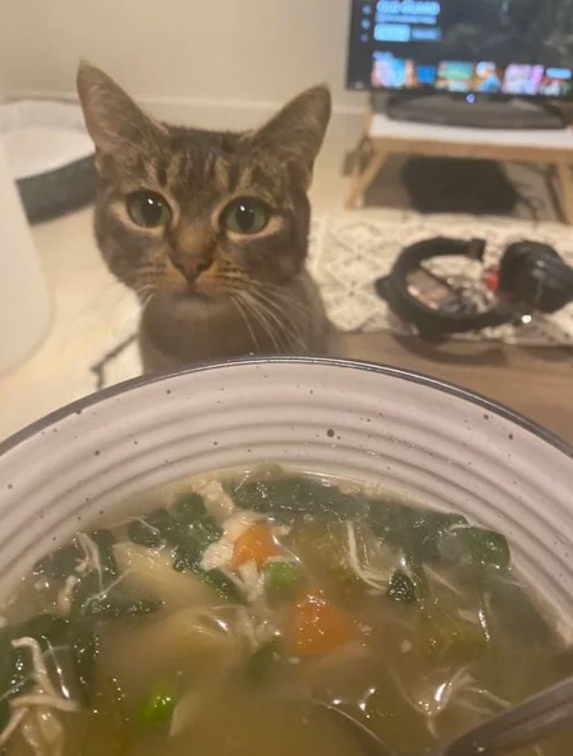 2020年08月21日誰是「偷蛋賊」?有一天國外推主@bbykaat在家裡吃拉麵,一轉頭的功夫碗裡的溫泉蛋就少了一塊。她很快抓到了小偷,那就是她養的貓咪!這隻貓咪對食物很執著,看到美味就迫不及待撲上去品嚐,連主人碗裡的美食都不放過,簡直無法無天。