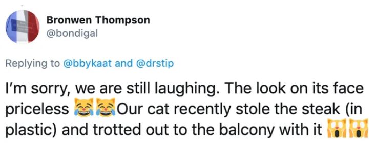 ▼「抱歉,我笑到停不下來。牠的表情太經典了,我家的貓貓最近也偷吃了一塊牛排,明明是裝在塑膠袋裡的,結果牠一得逞就跑到陽台上去了。」