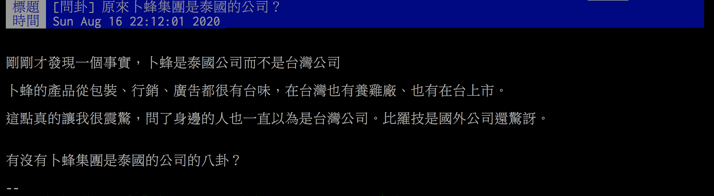 ▼文章一發,馬上引起網友議論紛紛,直呼「我也以為是台灣」、「我今天才知道」,知道詳情的網友則表示,卜蜂是泰國華僑謝氏兄弟經營,開業時在台、泰各開一間。還有網友說卜蜂跟樂天(lotte)很相似,都是在兩個以上的國家設立總部的模式。