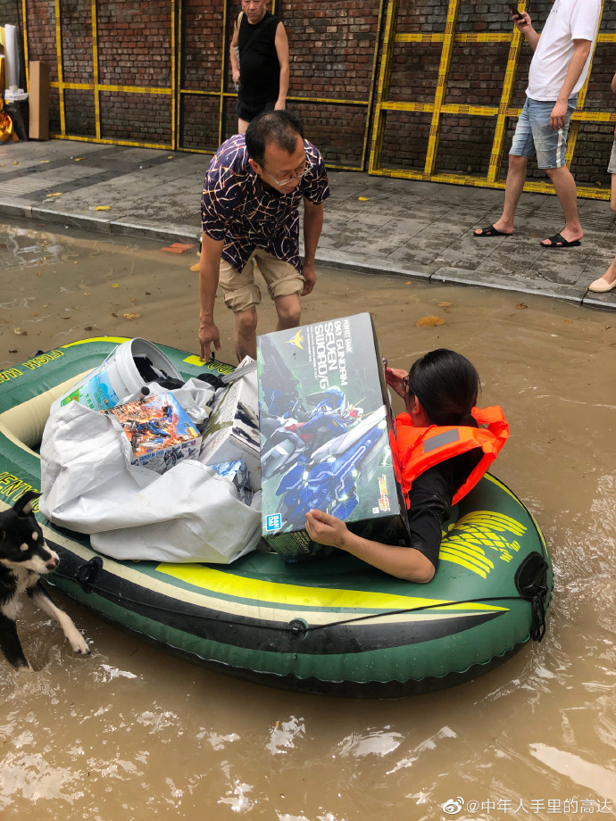 ▼在8月19日,重慶魚洞的一位鄭姓男子接到公司會淹水的消息,他猜想洪水可能只會淹到一樓,於是先將一樓的東西騰空,誰知道一覺醒來,社區淹水的高度再次刷新,於是擔心起自己放在公司二樓的鋼彈模型,想到新入手的心愛模型還放在二樓,很有可能會被水淹到,就很不安。但是他一點都不會游泳,於是心想只能先放那些模型不管了。