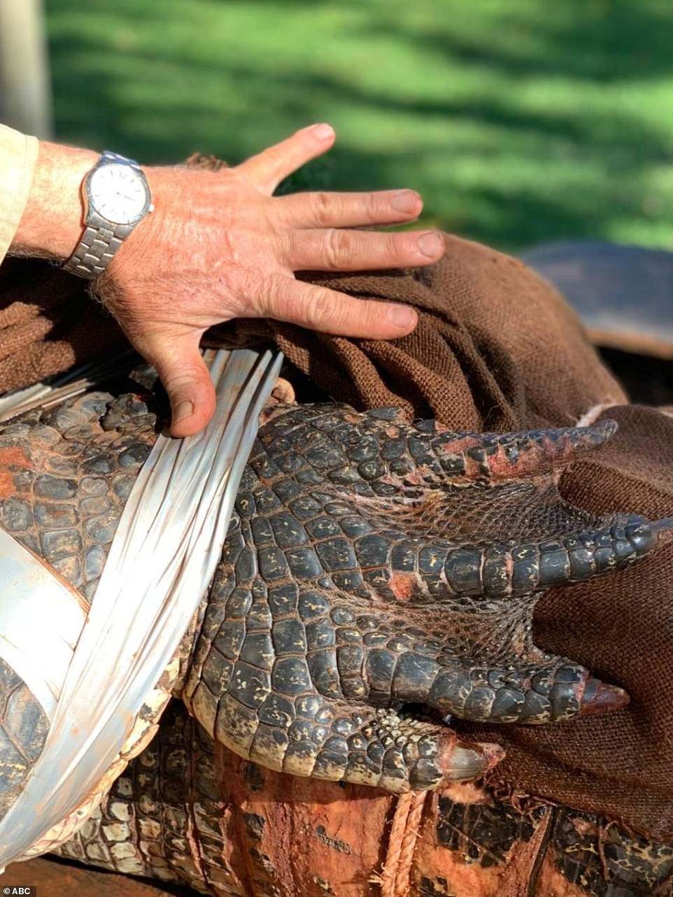 ▼從照片中就能看出,這隻鱷魚體型巨大,牠的手比人類的手要大很多。John Burke說:「如今正處於鱷魚的繁殖季,牠們非常活躍,尤其是體型較大的雄鱷魚,會比平時要暴躁很多。」