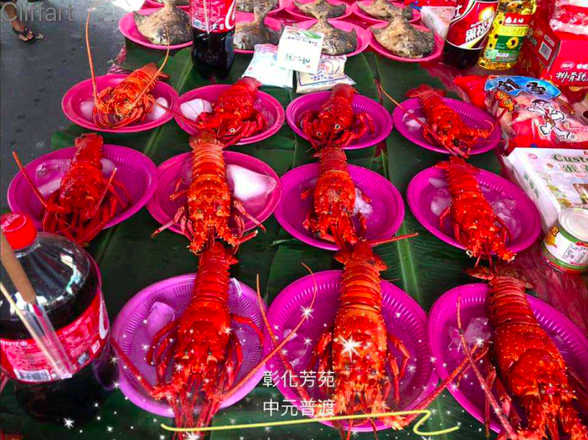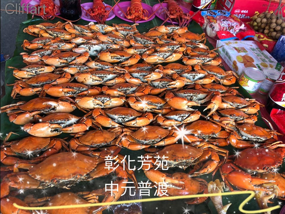▼這是彰化芳苑的普渡現場,桌子上全都是美食和飲料。除了最基本的水果、餅乾零食、可樂和沙士,還有白鯧魚、蛤蜊、全雞、豬肉,其中最顯眼的則是碩大的螃蟹和龍蝦。