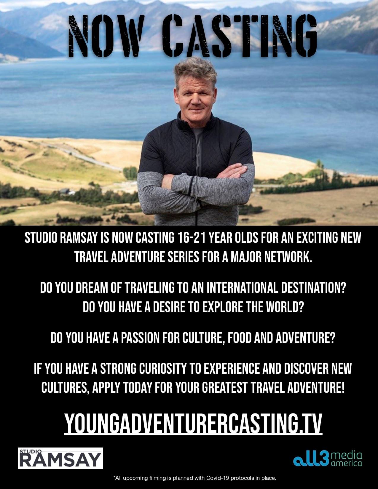 2020年09月07日英國名廚戈登拉姆齊(Gordon Ramsay)正在為自己的全新旅行節目尋找候選人。如果你的年齡在16到21歲之間,個人特色鮮明,對美食和冒險充滿熱情,喜歡攀岩、露營就可以報名!這是一個旅行的好機會,不是嗎?