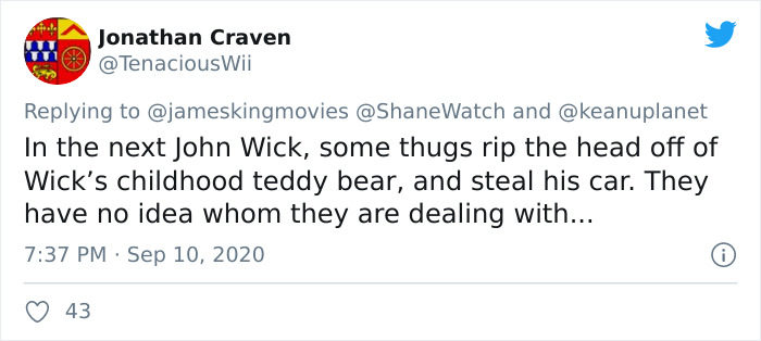 ▼「下一部《捍衛任務》裡,會有惡棍把基哥的童年熊熊玩伴的頭扭掉,然後偷他的車。他們根本不知道自己惹到了誰!」