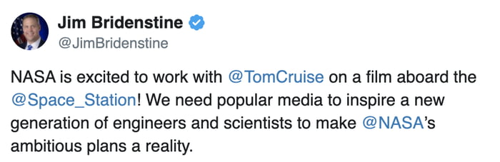 ▼NASA的Jim Bridenstine也確認,湯姆克魯斯將在NASA的協助下到國際太空站拍電影。如果一切順利的話,這將是第一部在真實太空中取景的影片。