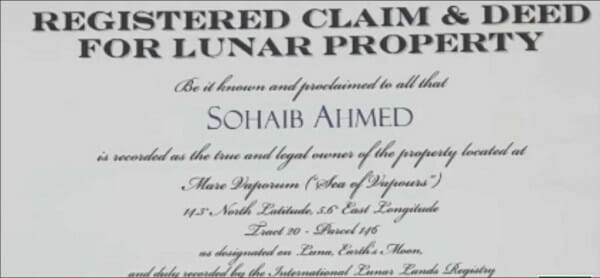 ▼他透過「月球定居協議」(Lunar Settlement Initiative),向「國際月球土地註冊局」(International Lunar Lands Registry)購買了蒸氣海這片土地,而這樣的一片土地其實只花了阿梅德45美元(約新台幣1310元),而當未婚妻瑪迪哈(Madiha)向親友炫耀時,朋友們都還不太相信,直到看到了美國寄來的「月球地契證明」,這才信服了這件寵妻無極限的事。