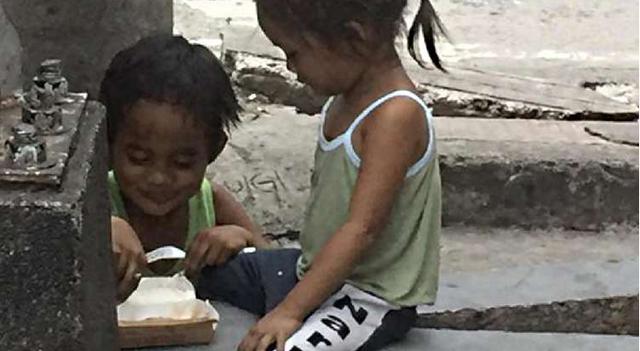 ▼當時這對情侶並沒覺得不對,還以為小男孩將食物拿回家吃了。但他們散步途中又看到了那個小男孩,他正面帶笑容給一個小女孩餵飯!原來這個小女孩是他的妹妹,這位小哥哥把自己乞討得來的食物全部餵給妹妹吃。