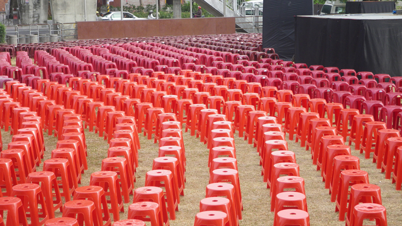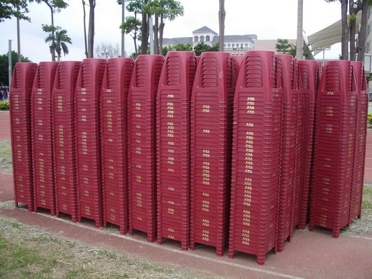 ▼原來這些塑膠椅疊在一起時,如果沒有這些圓洞會讓塑膠椅之間因為空氣壓力,形成近乎真空的狀態,會緊緊的吸在一起無法拔出。因此這些圓孔最主要的目的,就是疏通氣壓的功能。