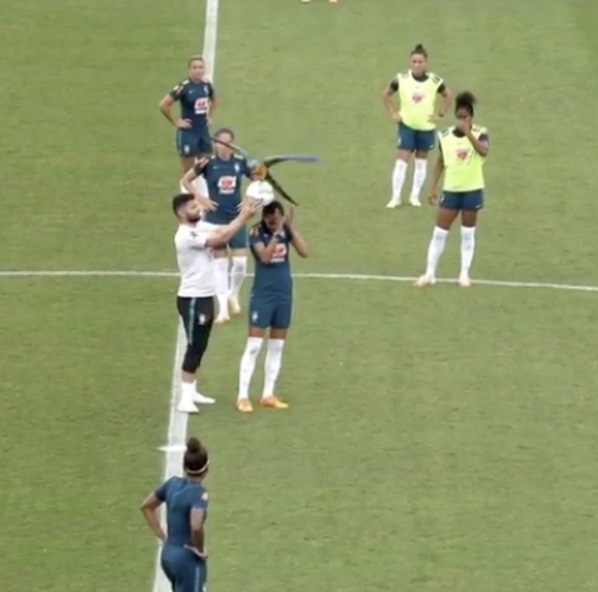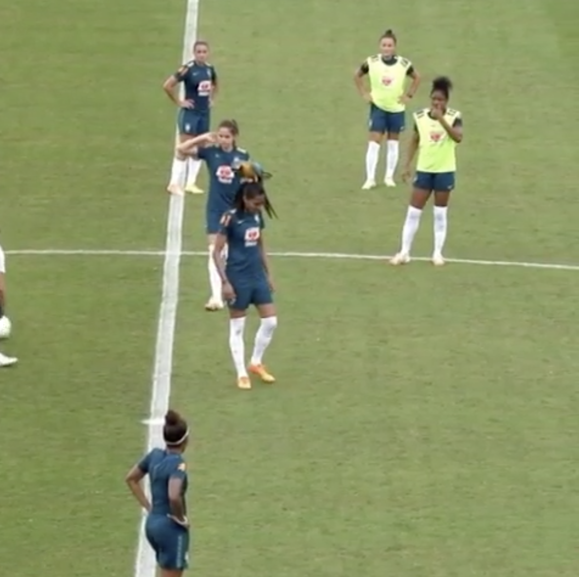 2020年10月05日足球場上經常出現不速之客,很多比賽曾因為貓咪、狗狗等動物闖入而被迫中斷。最近巴西國家女子足球隊在特雷索波利斯(Teresopolis)進行練習賽時,就被一隻動物打斷了。這隻動物是一隻金剛鸚鵡,牠停在一名隊員Bruna Benites的頭上,害她根本沒辦法專心踢球~