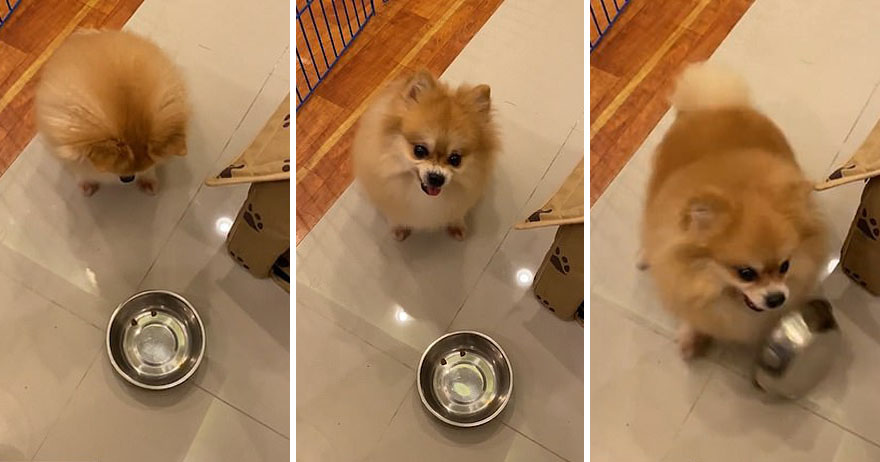 ▼Pao原本很期待吃美食,吐著舌頭開心等待飼主投餵。沒想到自己的碗裡只有2粒!牠愣在原地,然後慢動作抬頭看向主人,見主人沒有繼續倒飼料的打算,氣得往前猛衝,連狗碗都打翻了。