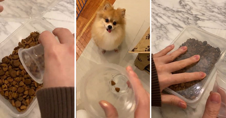 ▼那天飼主給Pao餵食時,跟牠開了一個小玩笑。飼主先挖起一整碗飼料,斟酌一會兒後又把大部分飼料倒回盒子裡,最後只剩下2粒。她將2粒飼料倒進狗碗,似乎說:「你要節食,這就是今天的全部食物啦。」