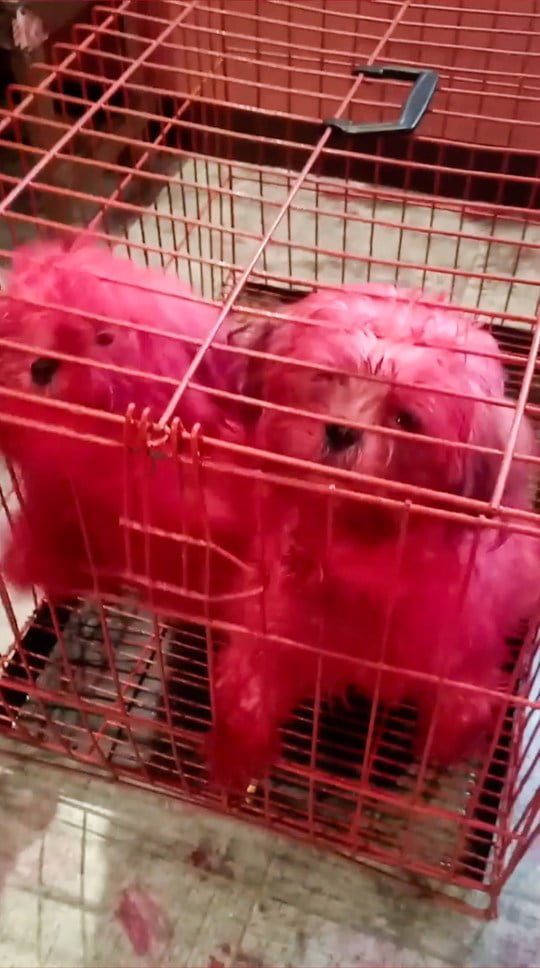 ▼狗狗們洗澡後身上的毛毛還帶有淡淡的粉紅色,幸好這種紅粉是純天然的,不會對健康有什麼影響,以後多洗幾次澡應該就會洗掉了。