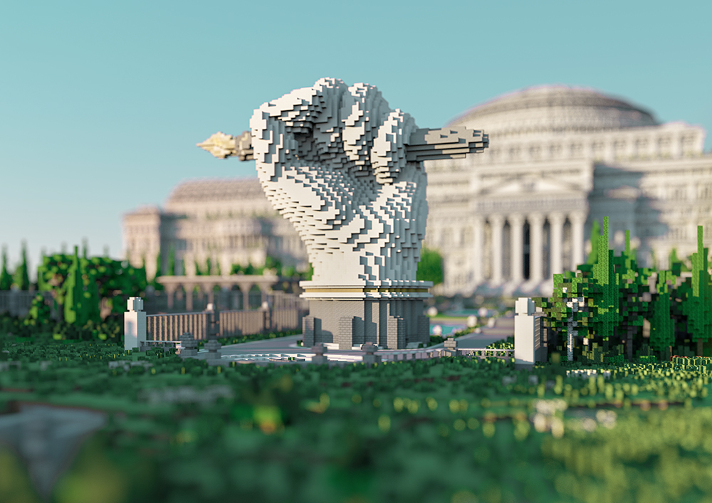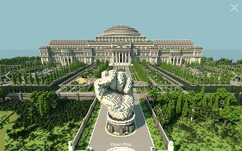 ▼無國界記者組織與去年創建官方「Minecraft 十週年紀念堂」的英國工作室Blockworks合作,召集16個國家共24位創世神玩家,以1250萬個麥塊建立這座圖書館,耗時總共三個月,館前放著手握筆的雕塑,象徵言論書寫自由。