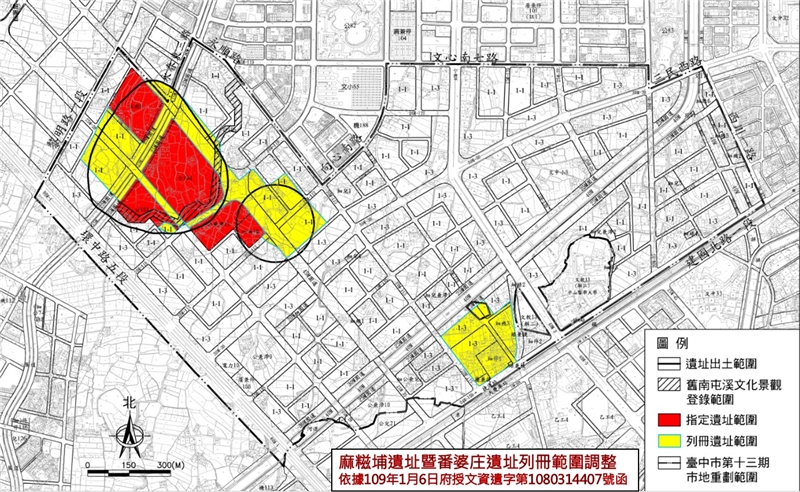 台中13期市地重劃區占地約229公頃,建商原本預訂2015年完成基礎建設及劃分土地。但其中10多公頃挖到了距今1700年的麻糍埔、番婆庄遺址。消息曝光後,台中文化資產審議保護委員會要求建商立即停工、搶救遺址。這不僅影響公共設施工程,還要進行大面積都市計劃變更。