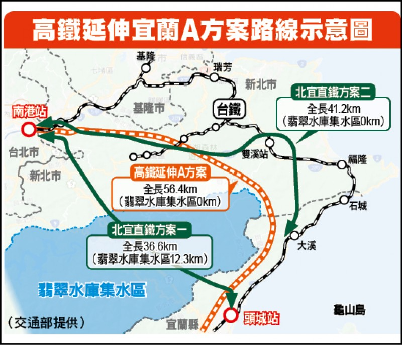 ▼交通部鐵道局評估的北宜高鐵路廊有3條,其中2條經翡翠水庫水源保護區,分別是全長54.1公里的方案B、全長45公里的方案C。方案B有3.8公里會經過翡翠水庫集水區;方案C路線雖最短,卻有11.6公里會經過翡翠水庫;全長56.4公里的方案A,路線雖最長,卻完全沒有經過翡翠水庫集水區。雖然高鐵延伸宜蘭案選擇了繞過翡翠水庫的方案,但為來還是需要做綜合評估和整體的環評。